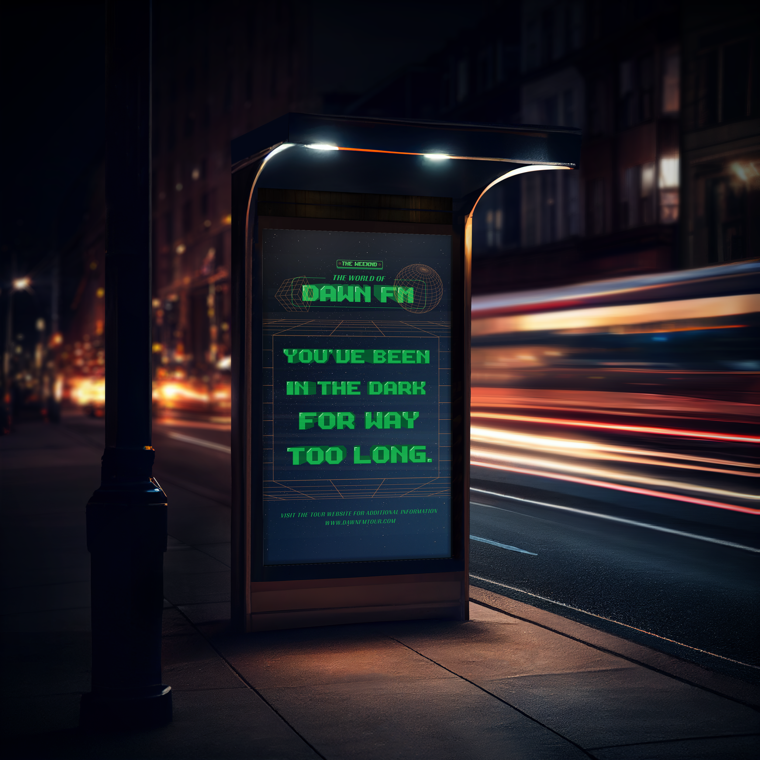 Developed conceptual branding guidelines for The World of Dawn FM music tour, creating a new brand identity and visual assets for The Weeknd’s album release of Dawn FM.