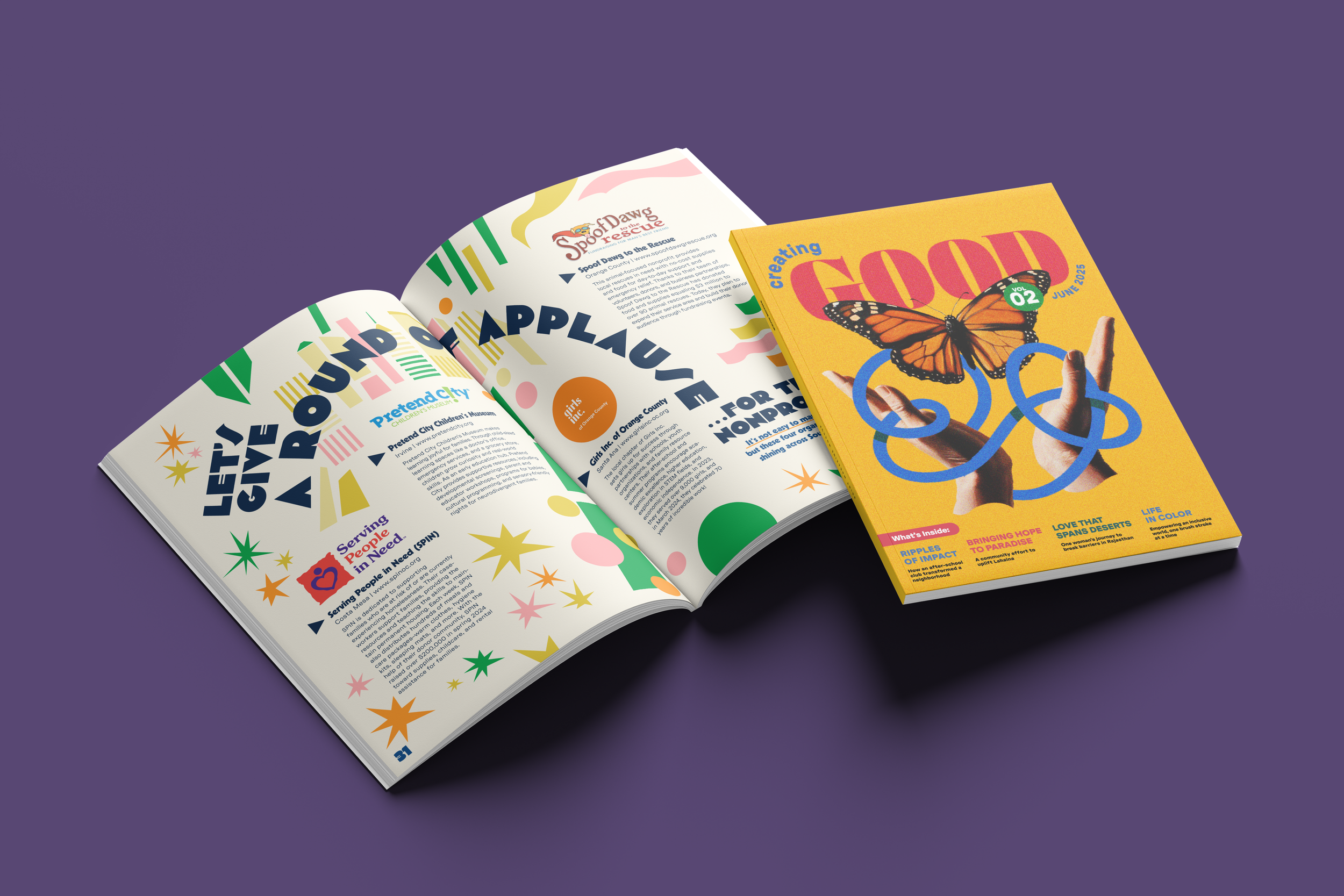 The second edition of Creating Good Magazine highlights diverse clients and nonprofits committed to positive global impact. It features stories of compassion, and community to inspire readers to join the movement for positive change. The design uses a playful, modern style with bold typography, vibrant colors, and engaging layouts, creating an optimistic, uplifting tone. I led the creative direction, developing the central mood board, color scheme, and typography, as well as crafted the masthead to reflect the magazine's unique identity.